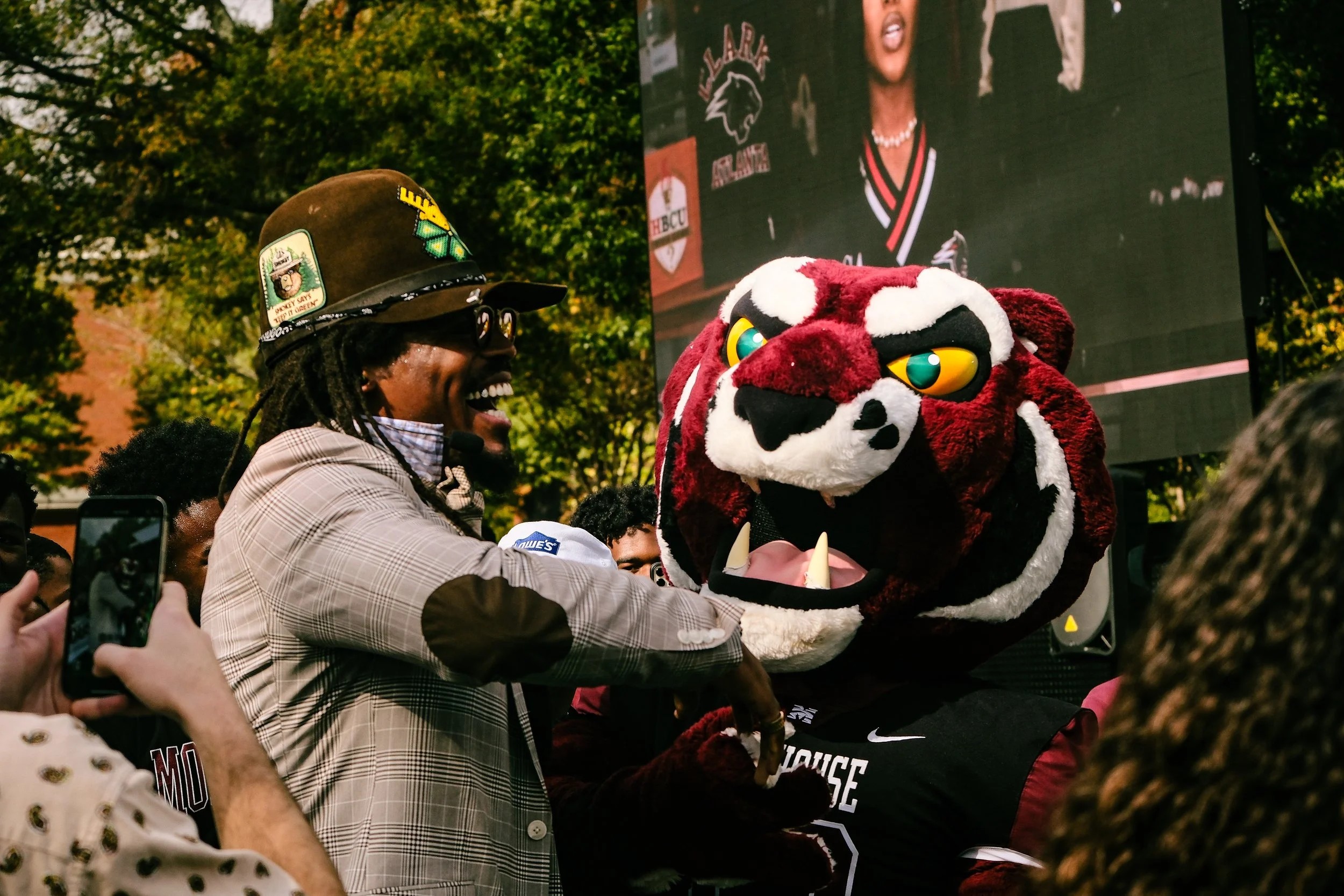 A man with dreadlocks and glasses smiling and interacting with a person in a red and black panther mascot costume during an outdoor event, with a large digital screen and trees in the background.