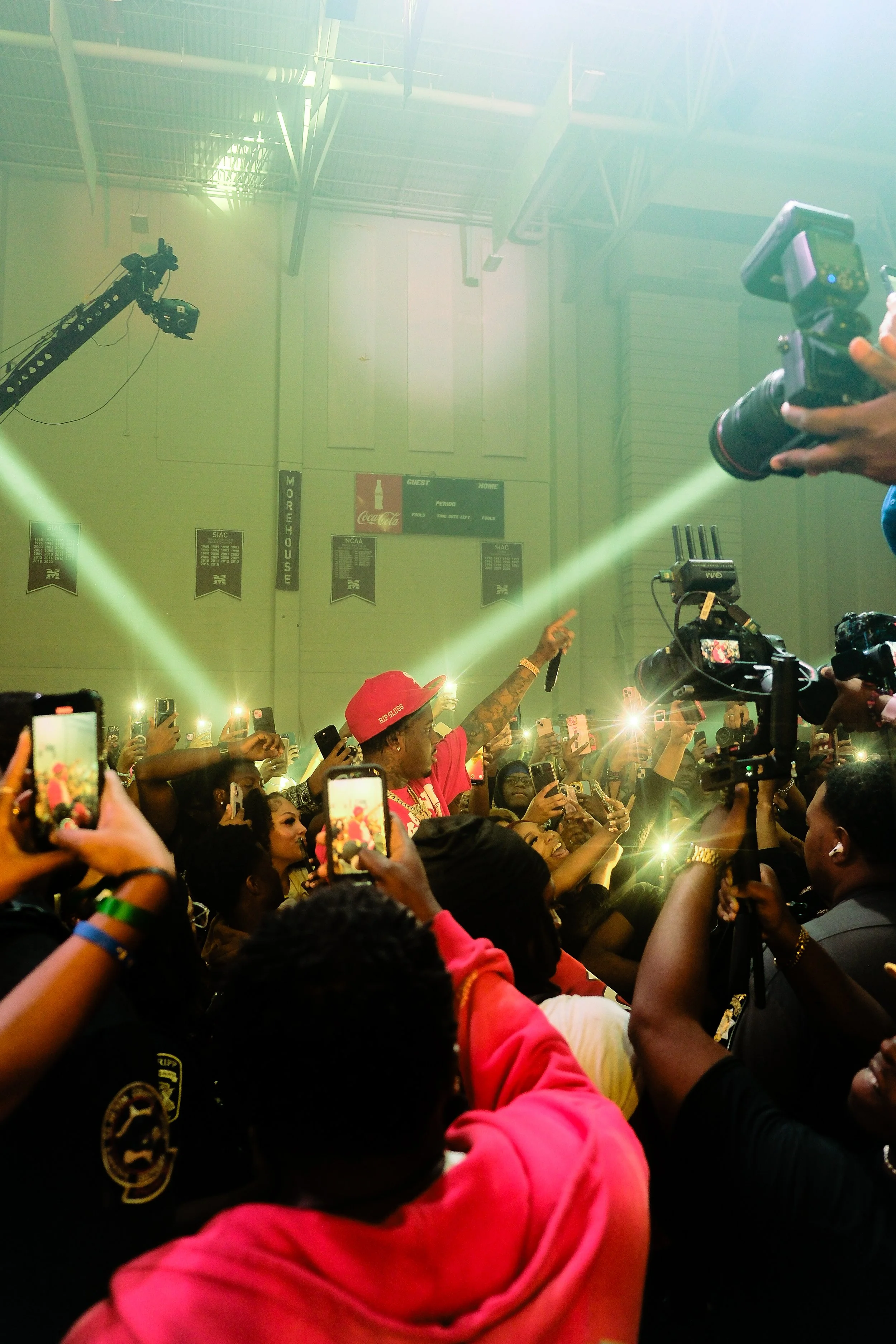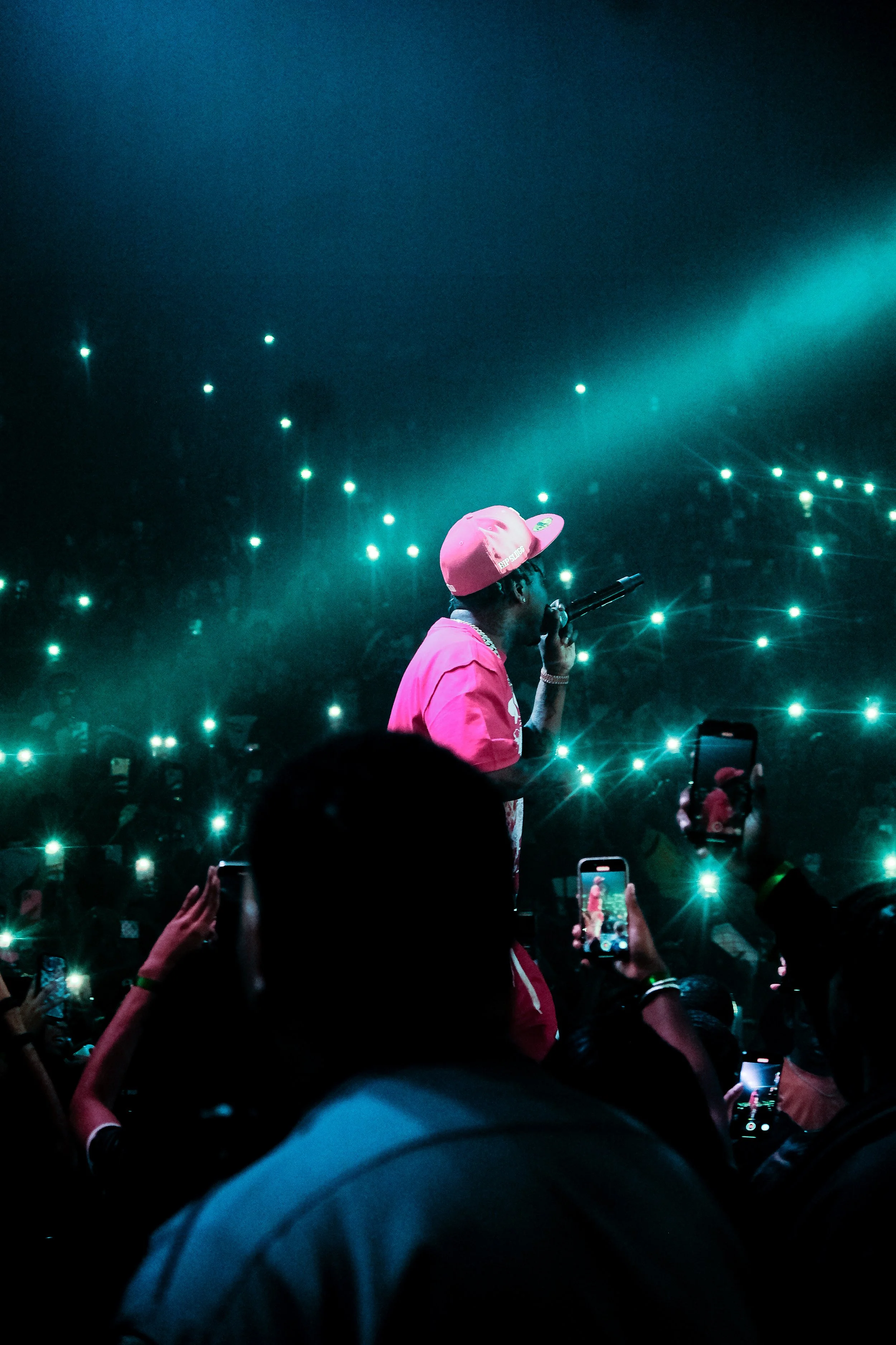 A performer in a pink cap and matching pink outfit holding a microphone on stage during a concert, with many audience members capturing the moment on their phones, illuminated by colorful stage lights.