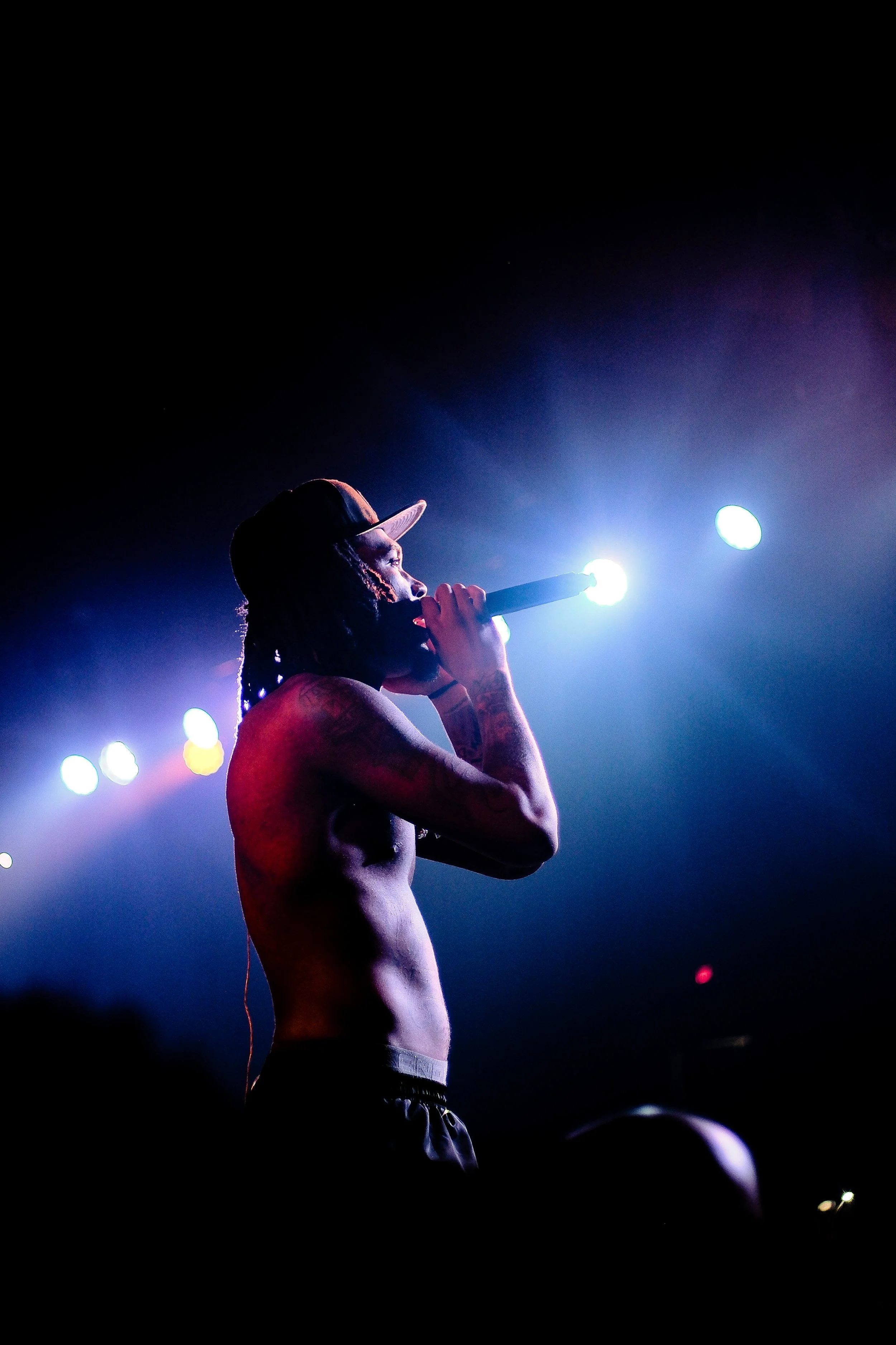 A shirtless male performer with dreadlocks and tattoos holding a microphone with a bright light at one end, performing on stage with colorful lights in the background.