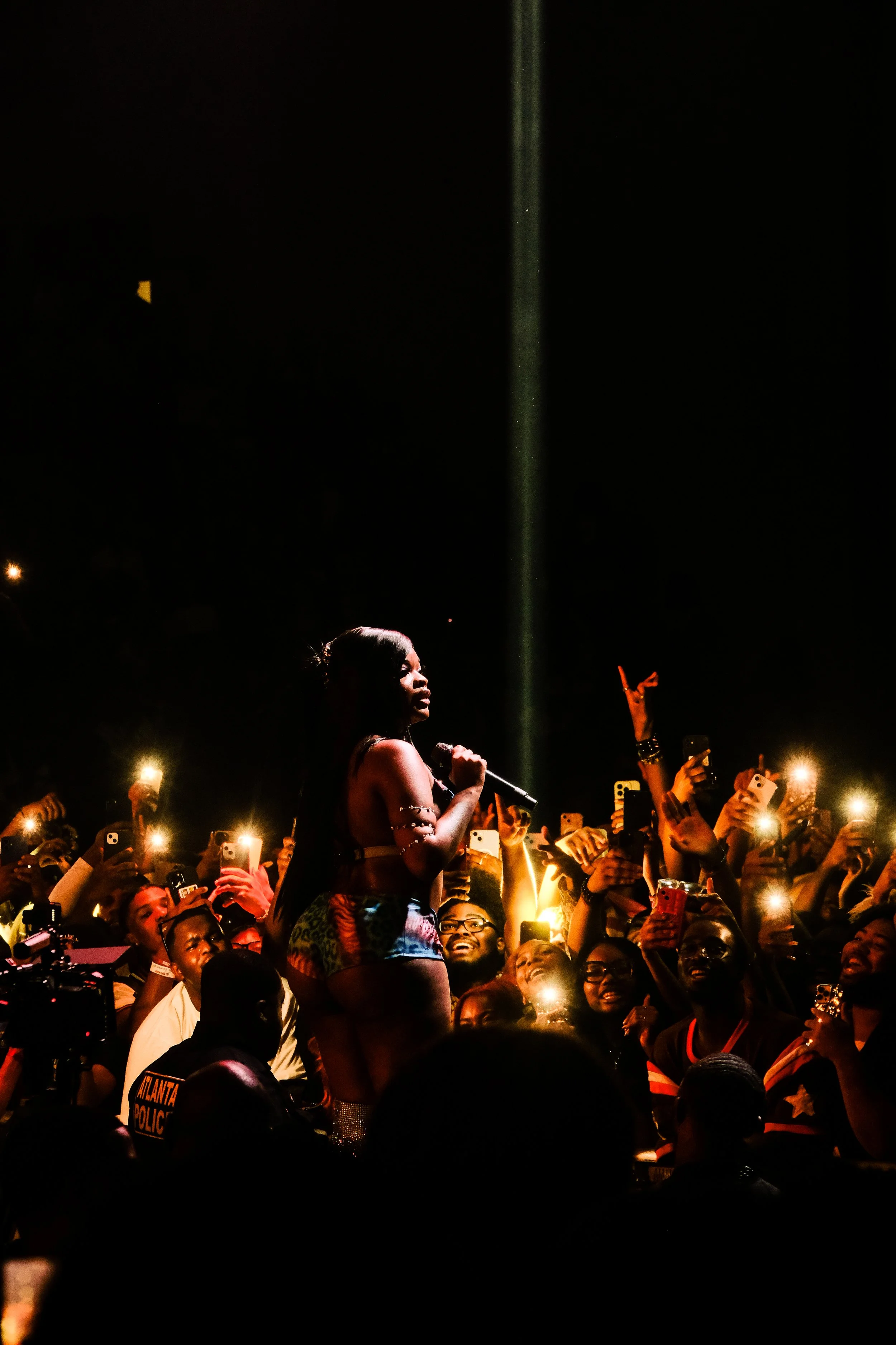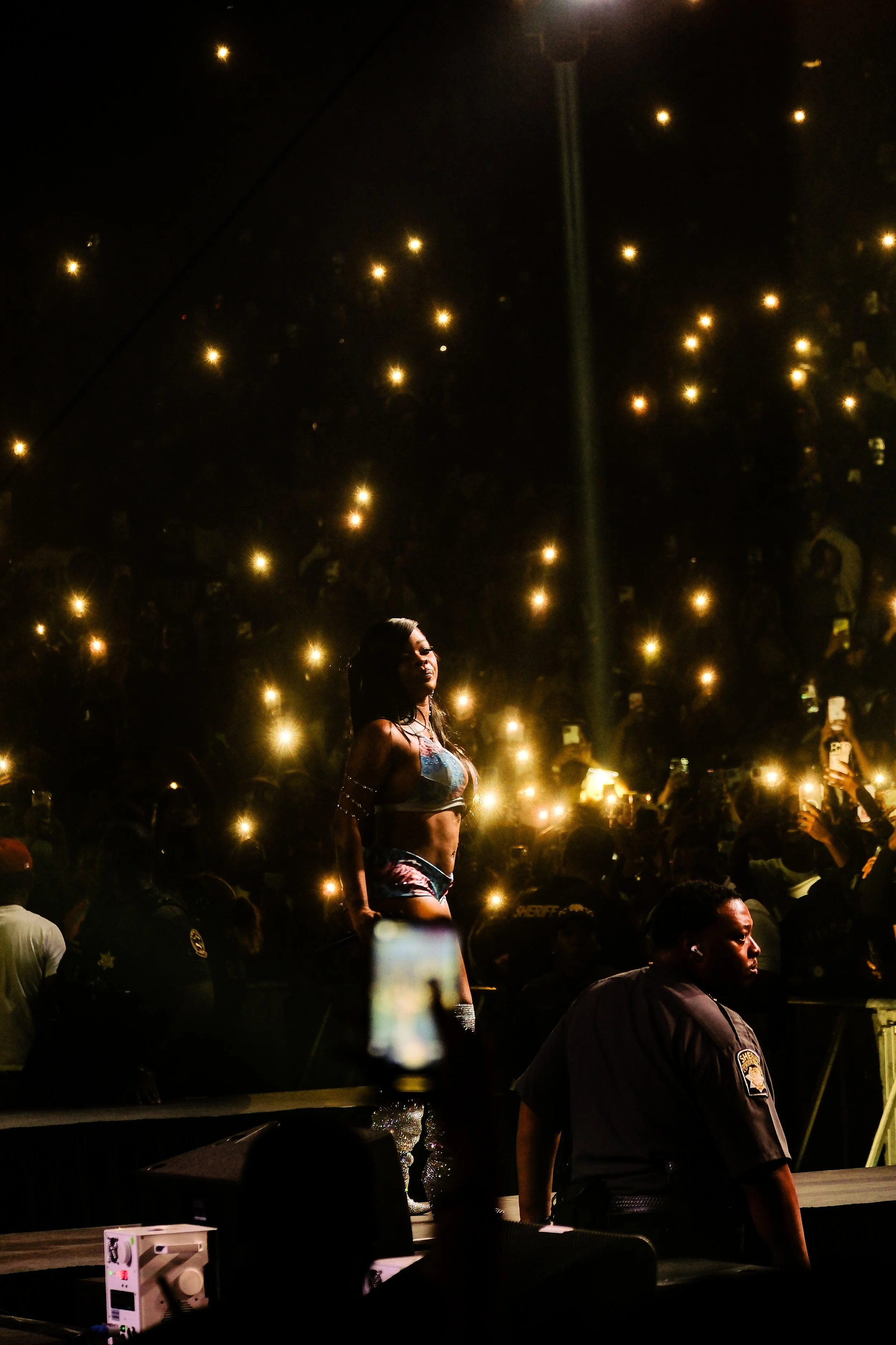 A woman in colorful outfit on stage during a concert or event, surrounded by audience members taking photos, with many phone lights shining in the dark.