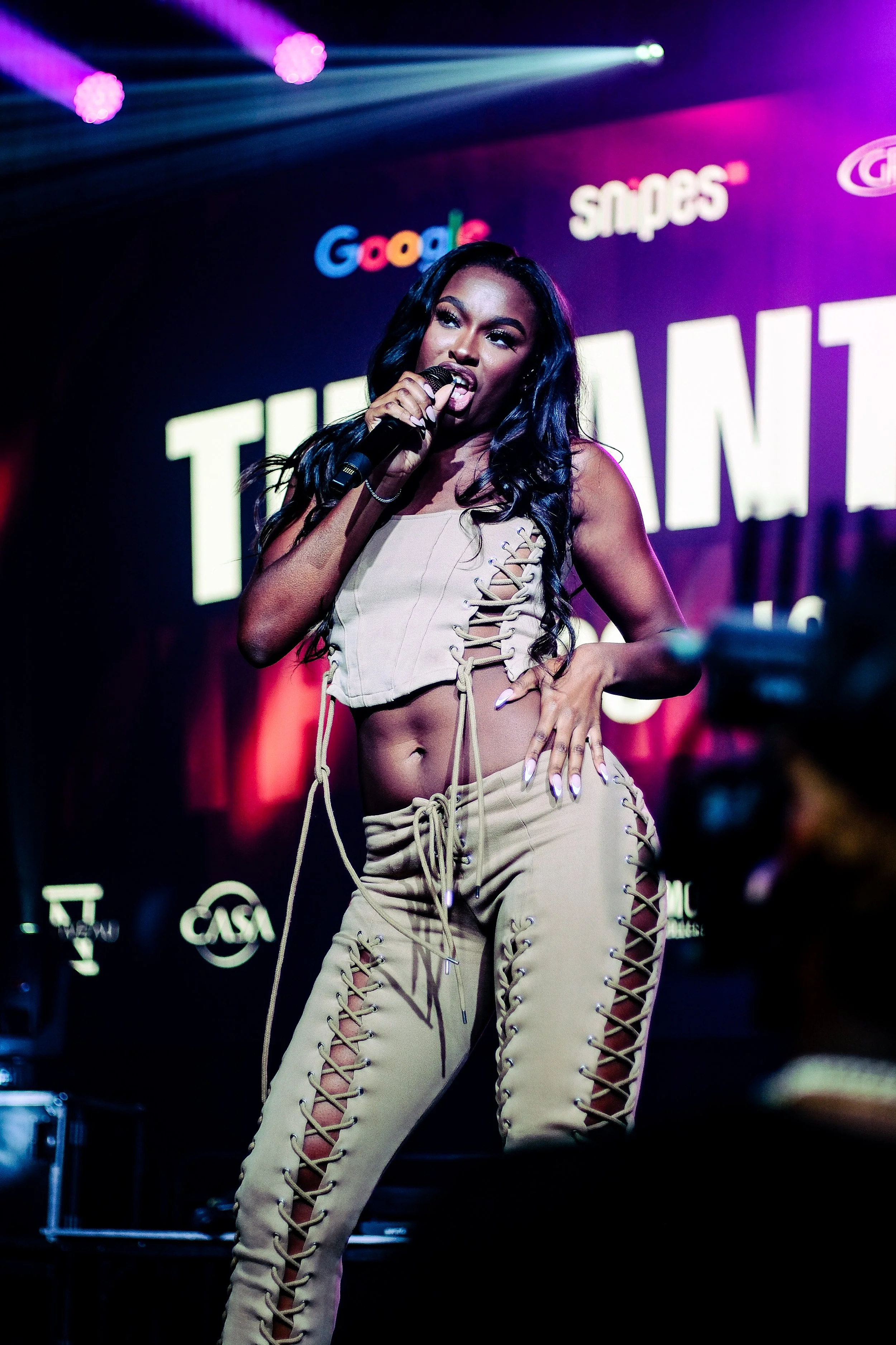 A woman singing on stage with a microphone in her hand, wearing a beige lace-up top and matching pants, with stage lights and logos in the background.