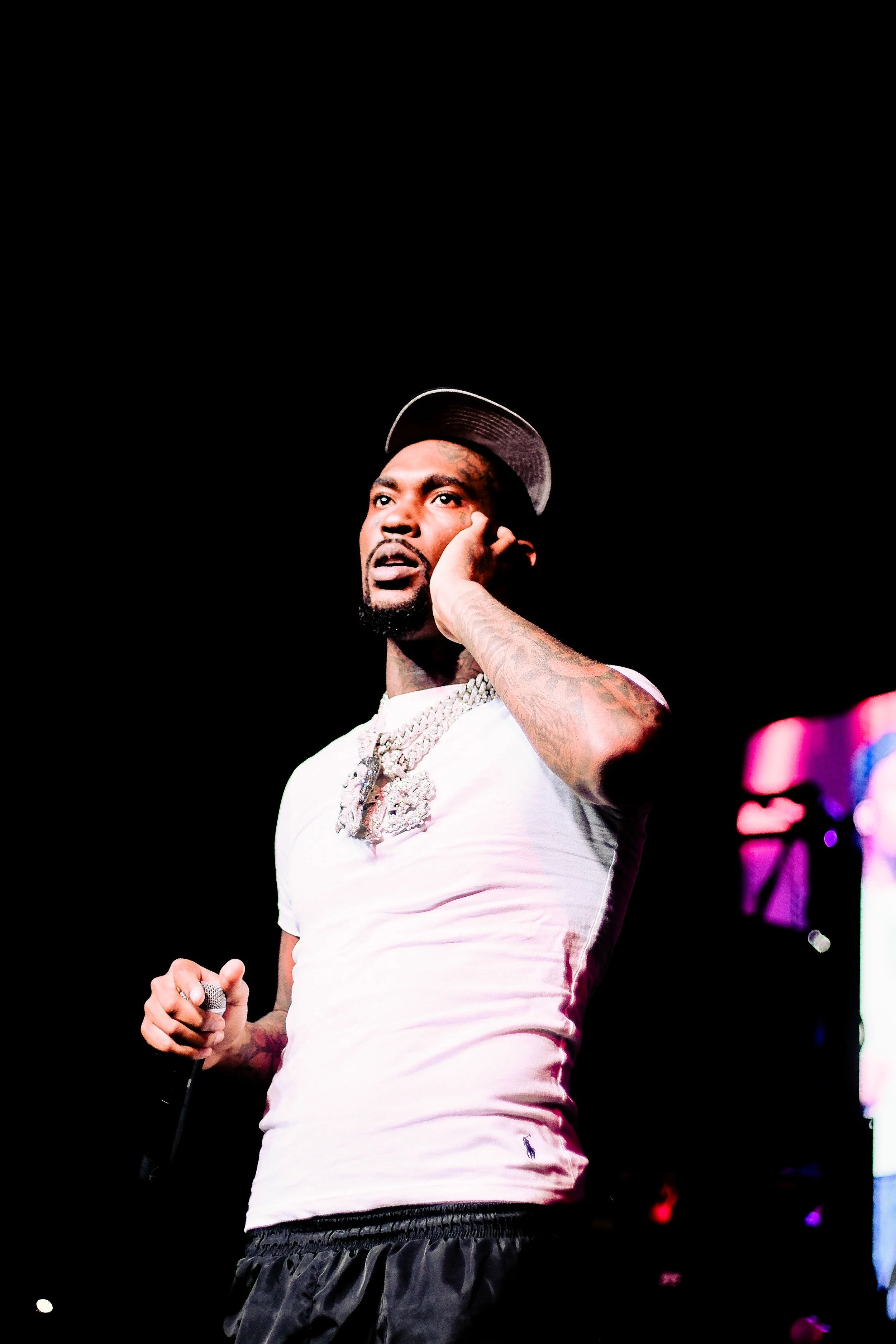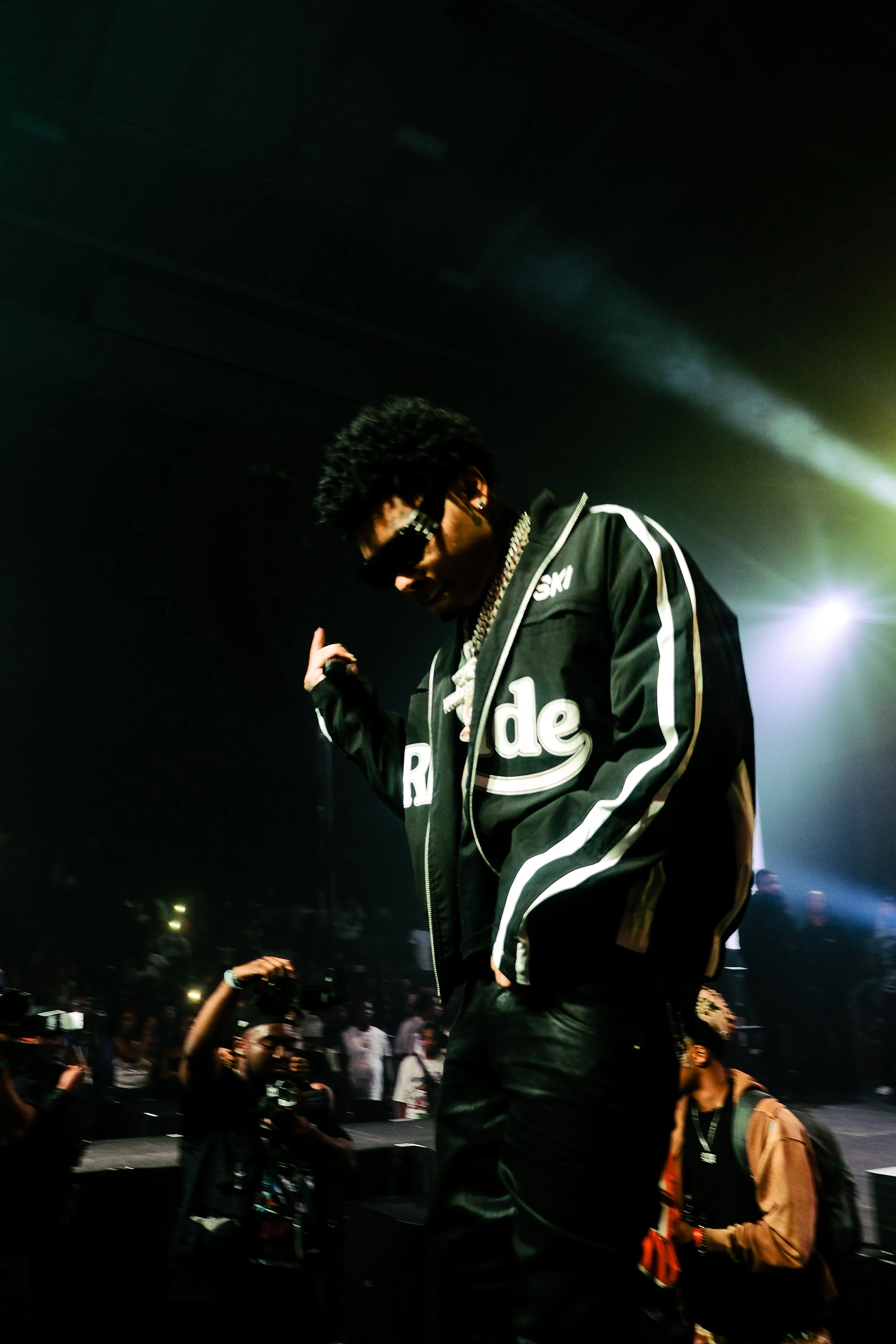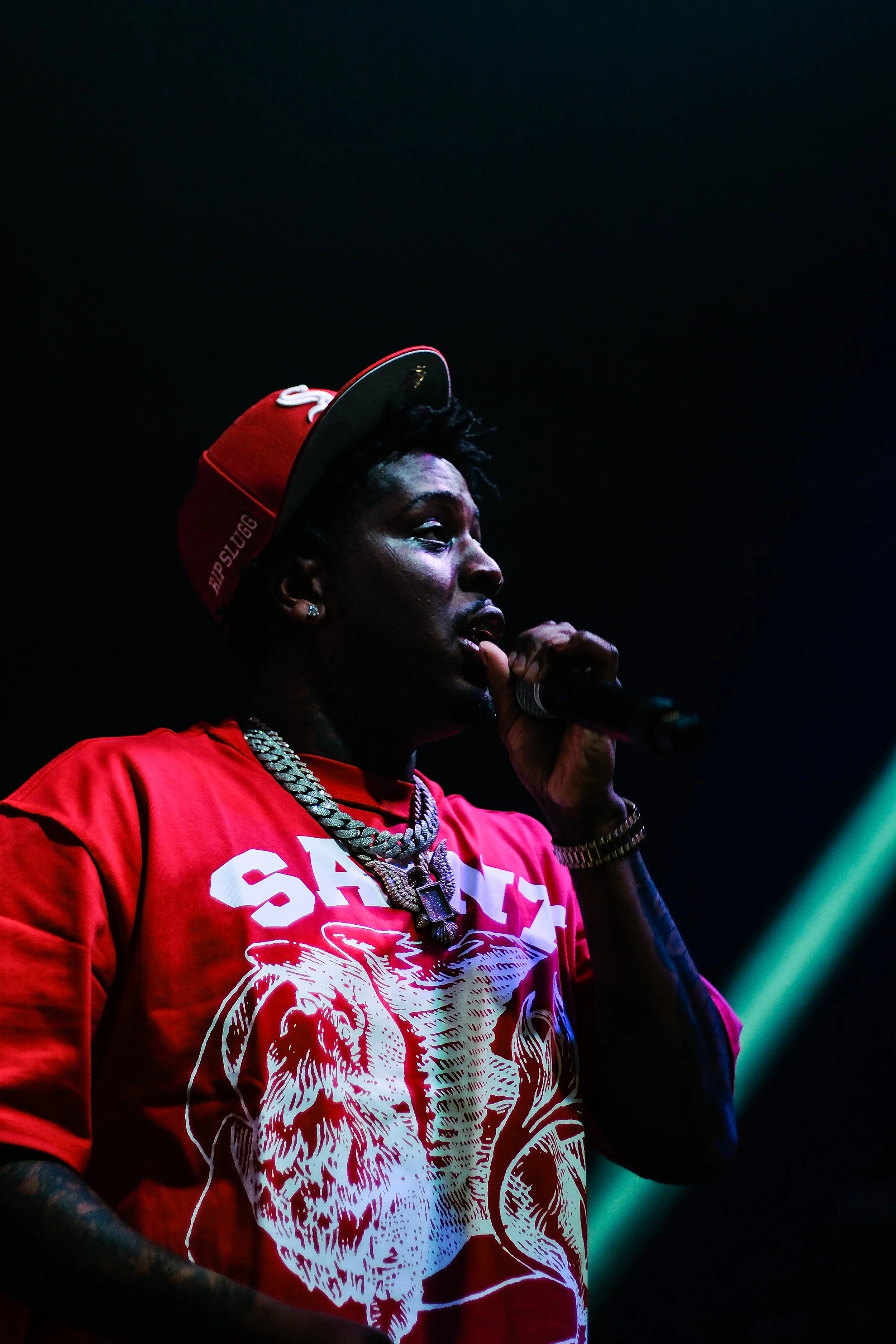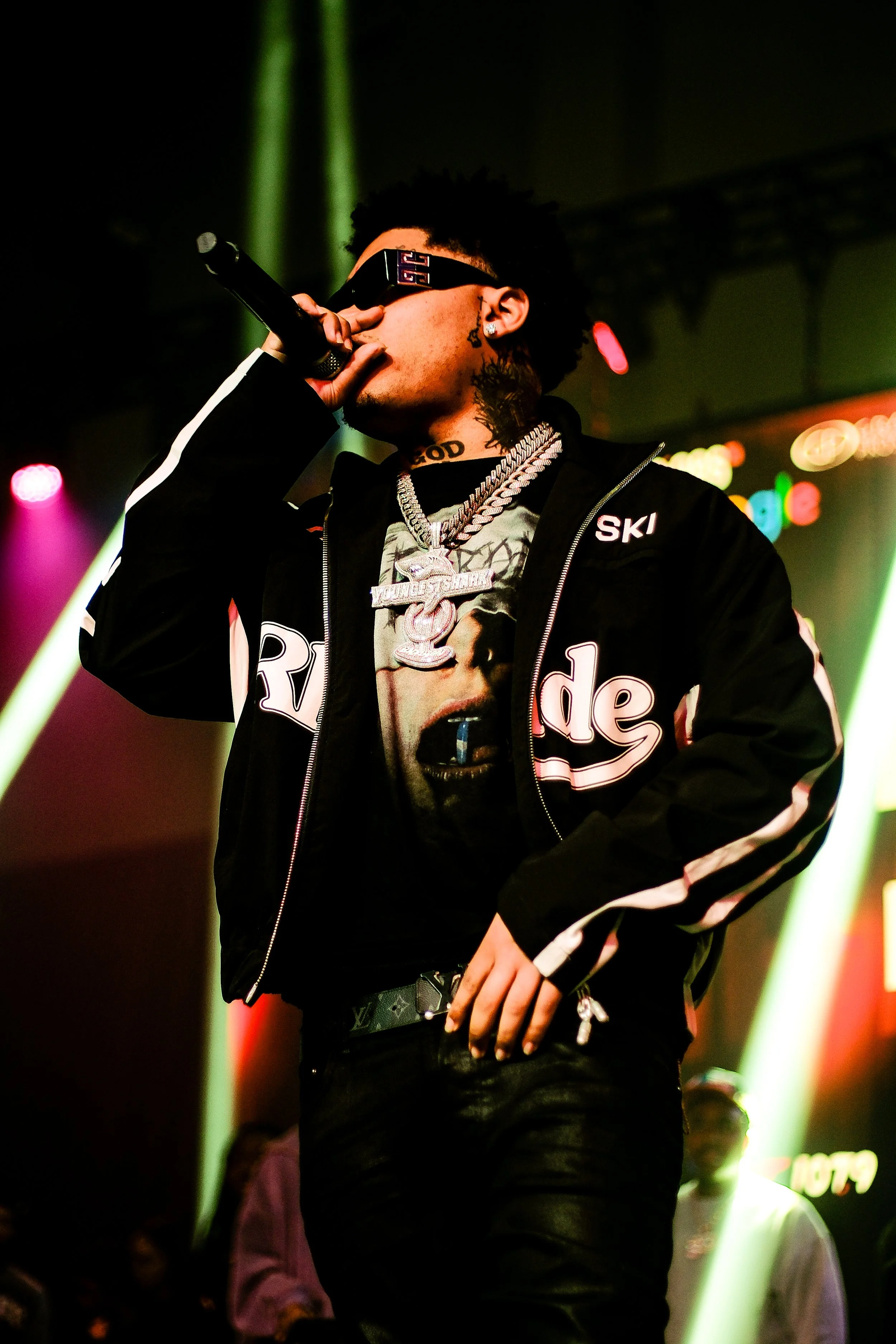 A rapper performs on stage, holding a microphone and wearing jewelry, a cap, and casual clothing. The background shows a large screen with partially visible text and a crowd of people.