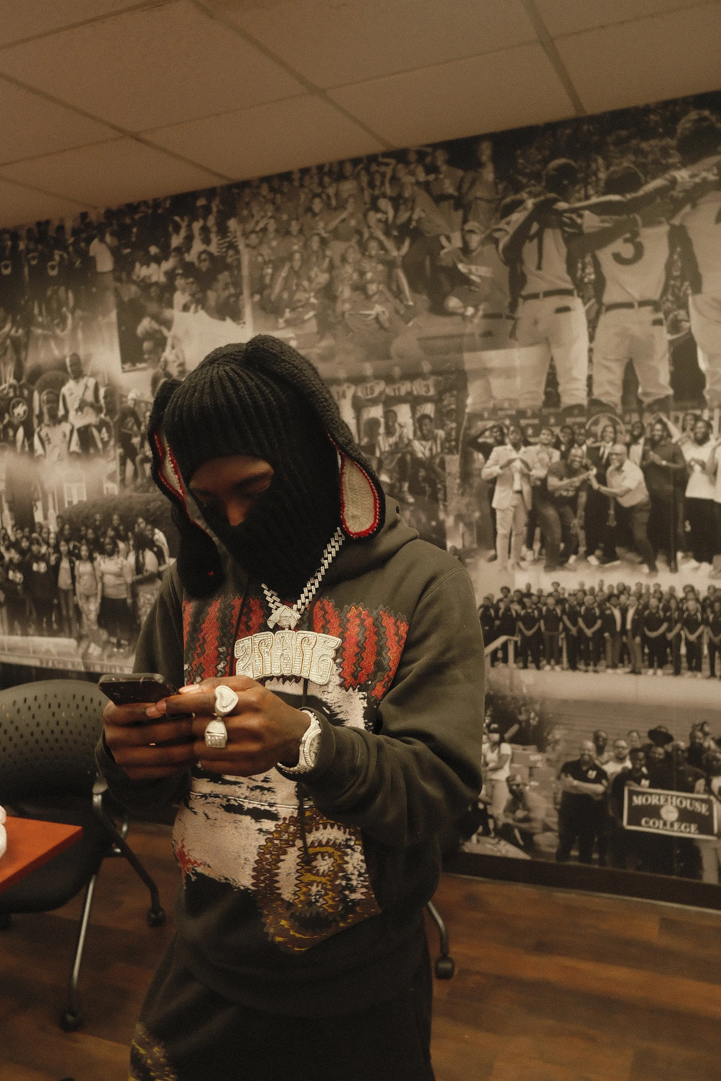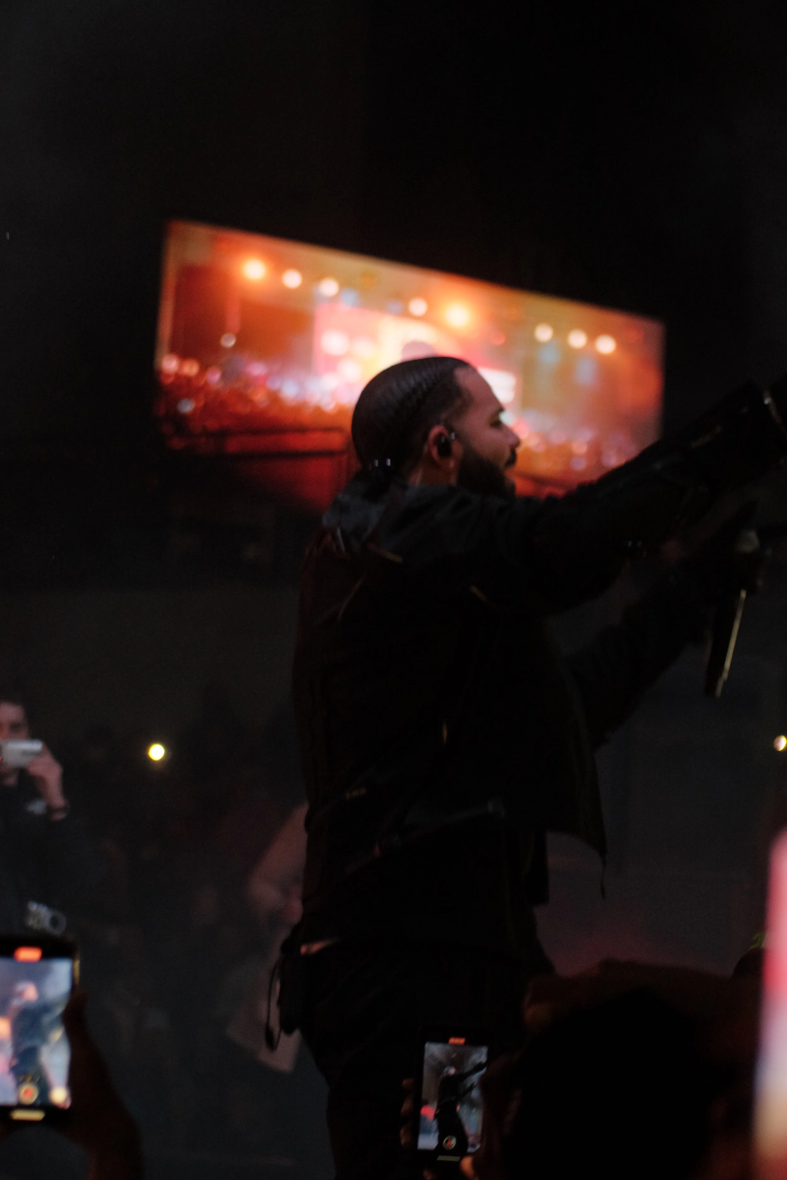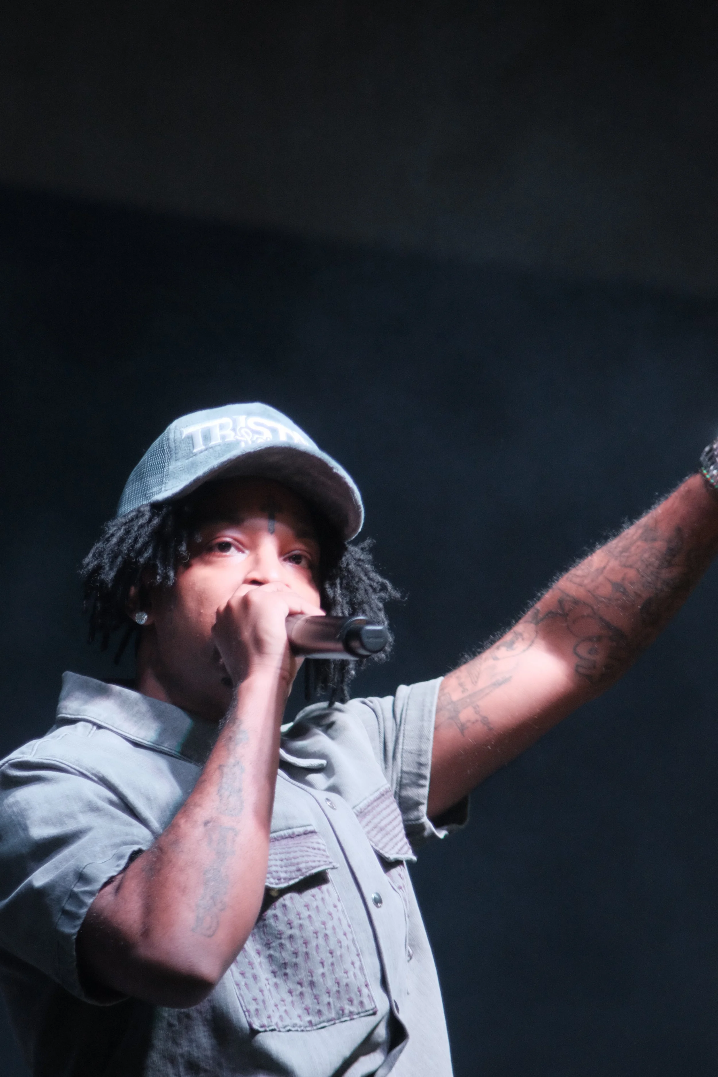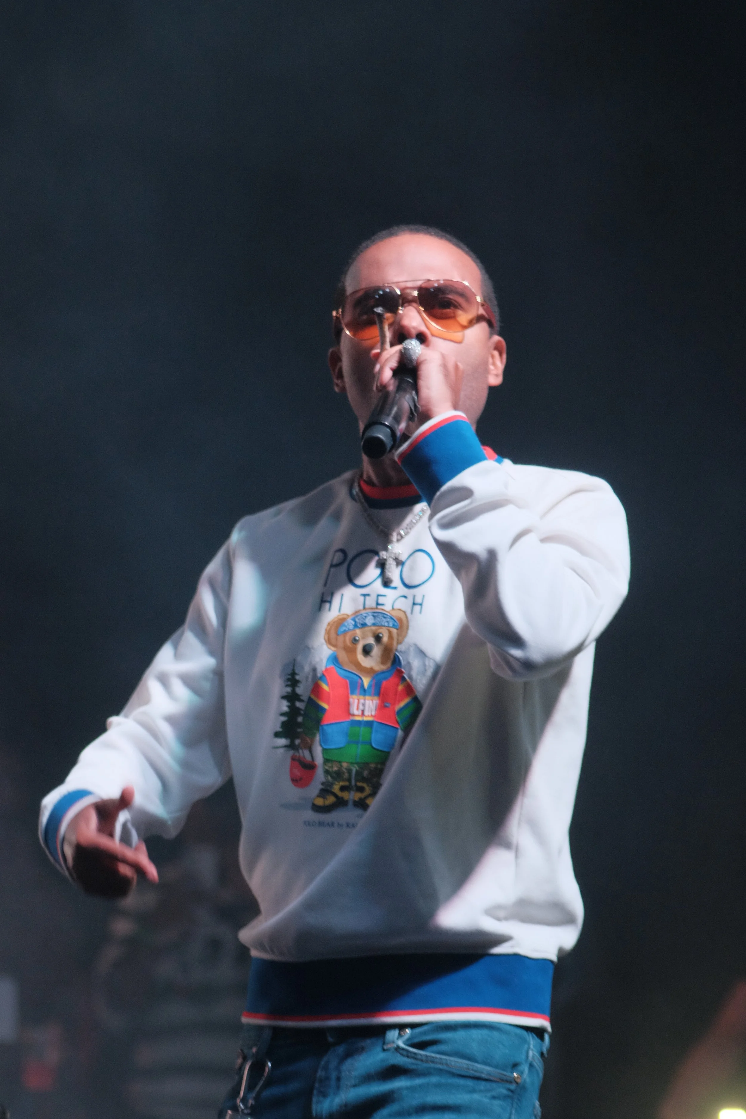 A rapper performs on stage, holding a microphone and wearing jewelry, a cap, and casual clothing. The background shows a large screen with partially visible text and a crowd of people.