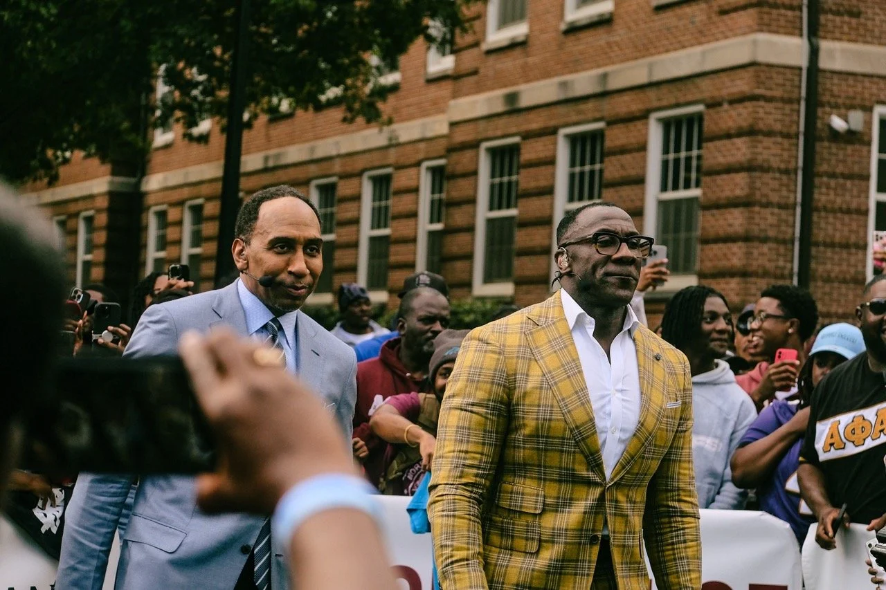 A crowd of people gathered outdoors with two men in the front, one in a light blue suit and the other in a yellow plaid jacket, walking forward. Many are taking photos or videos. The background features a brick building with multiple windows and trees.