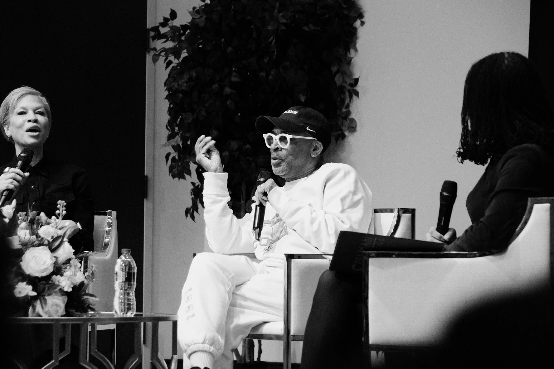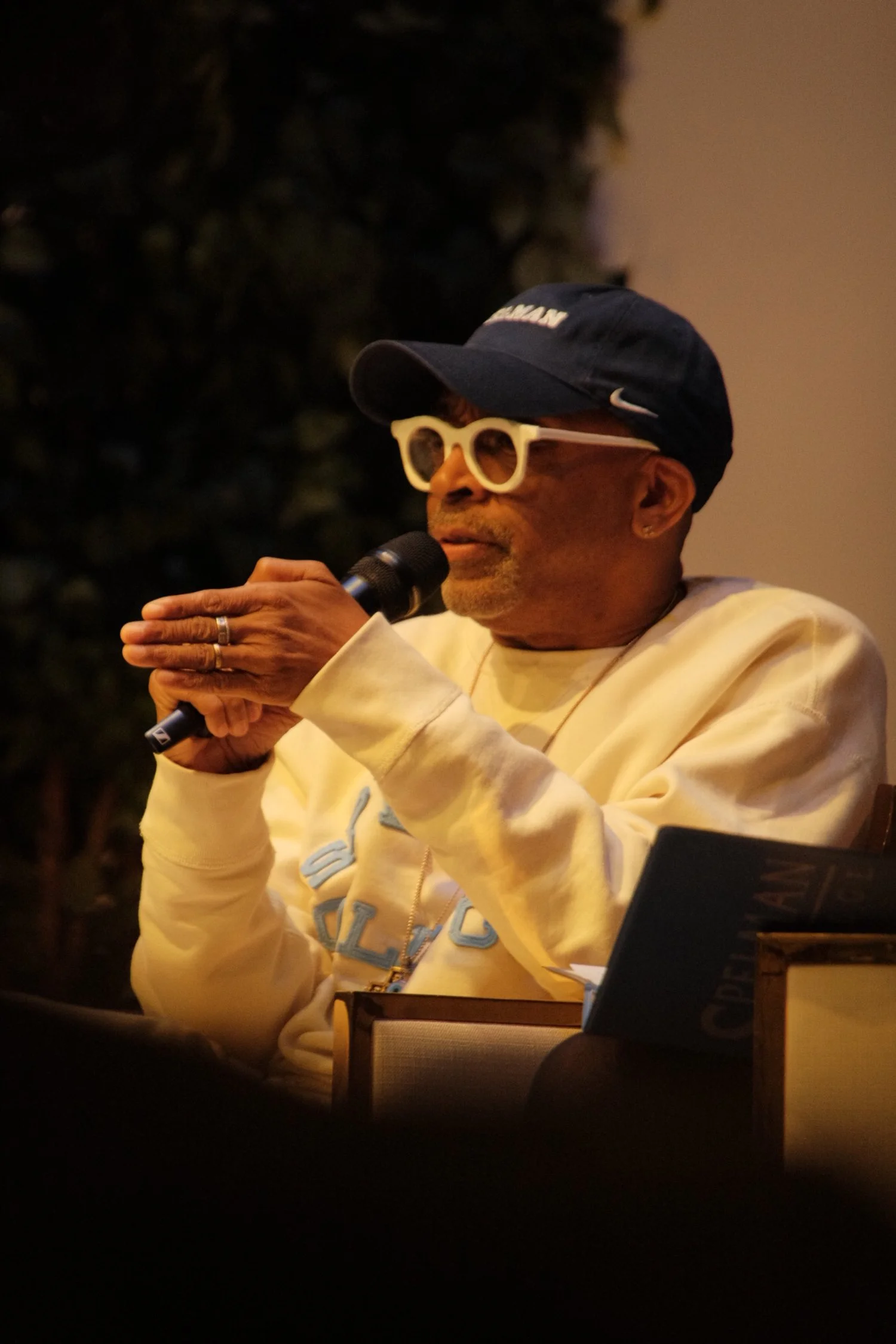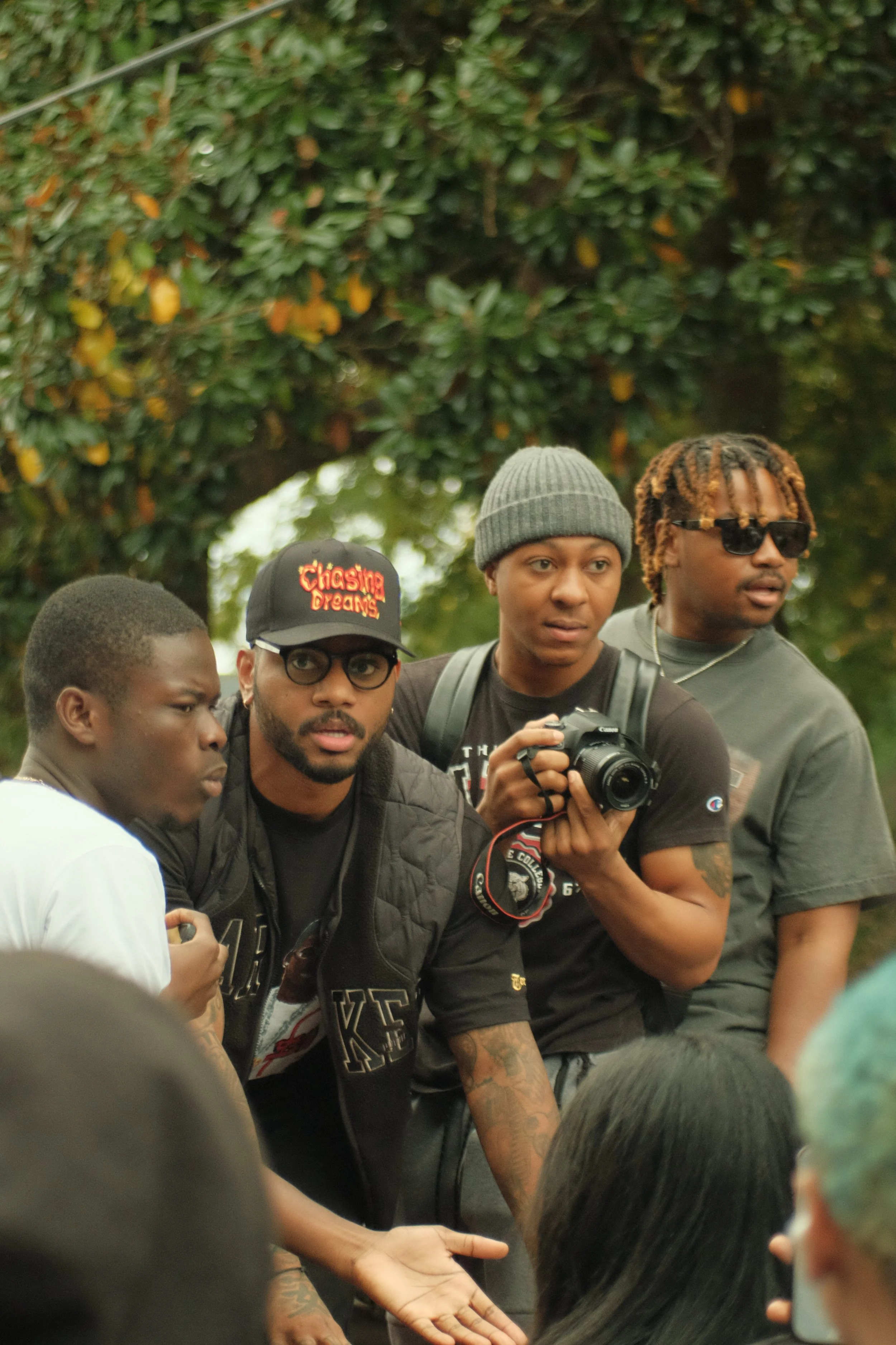 A man with long dreadlocks, wearing glasses, a plaid blazer, and a bow tie, stands in front of a crowd outside a brick building with a sign that reads "Merrill Hall." The crowd behind him is taking photos and watching him.